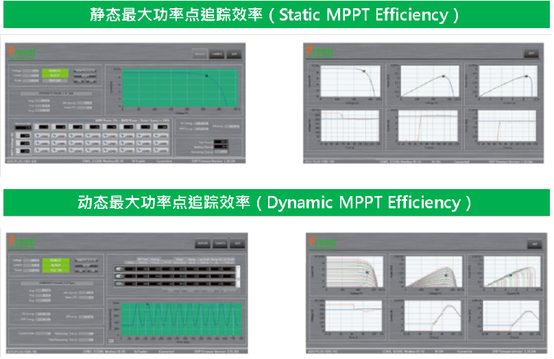 根據(jù)光伏逆變器規(guī)格設(shè)定開(kāi)路電壓(Voc)/短路電流(Isc)/最大功率點(diǎn)的電壓(Vmpp)和電流(Impp),系統(tǒng)將自動(dòng)建立能模擬太陽(yáng)能面板在一般日照度下的I-V曲線。透過(guò)系統(tǒng)內(nèi)部DSP晶片運(yùn)算即可演算出P-V及I-V曲線,輸出中具備動(dòng)態(tài)日照可調(diào)功能。