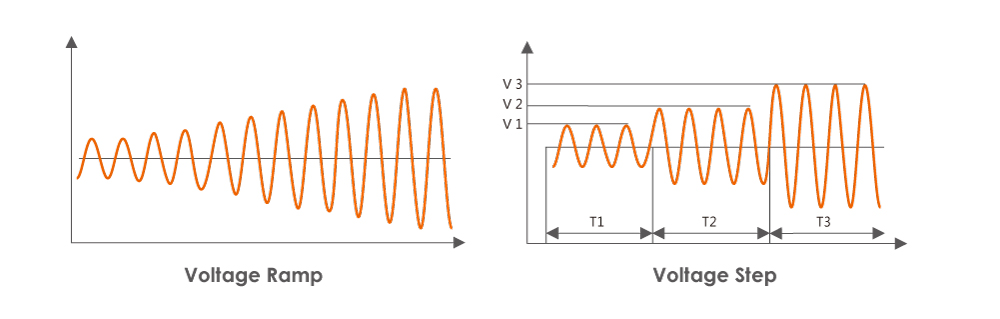 能分別設定24 組、12 組不同輸出電壓、輸出頻率及時間的步階與漸變記憶組,且可循環(huán)數(shù)百次。舉例來說,用戶可設定頻率45Hz逐漸增加到120Hz或電壓由0V逐漸增加到310V,模擬單一或連續(xù)的測試變化,以取代單純設置固定參數(shù)的測試方法;輕松完成復雜的測試程序,滿足各種負載輸入的特性。