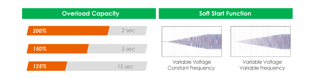 AFV可承受高達125%、150%、200%的電流過載;且透過軟啟動功能,能有效抑制開機時的高啟動電流,此功能適用于馬達、壓縮機等電機類產(chǎn)品,提供可靠的效能,達到長久的機器壽命。