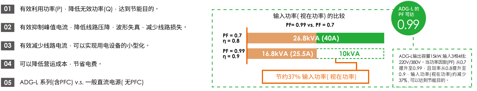 ADG-L 系列內(nèi)建PFC主動(dòng)功率因數(shù)校正的輸入功因可高達(dá)0.99,業(yè)界領(lǐng)先,將對(duì)電網(wǎng)干擾降到最小。
